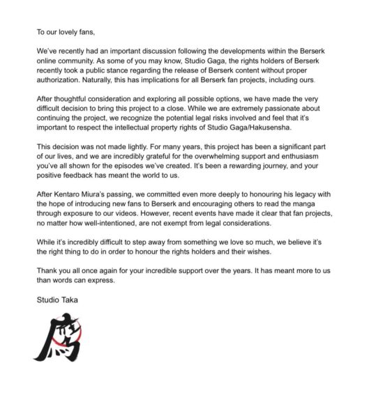 โดยทางกลุ่ม Studio Taka ที่เป็นกลุ่มแฟน ๆ ของเรื่อง Berserk ได้ประกาศยกเลิกโปรเจกต์ Berserk Motion Comic ซึ่งเป็นอนิเมชั่นสไตล์มังงะแล้วหลังจากที่ทางเจ้าของลิขสิทธิ์ออกมาเตือน Studio Eclypse เพราะหลังจากที่ทบทวนแล้ว อาจเสี่ยงถูกดำเนินคดีได้ ขณะเดียวกันทางกลุ่มก็จะเคารพในลิขสิทธิ์และความประสงค์ของ Studio Gaga/Hakusensha ด้วย