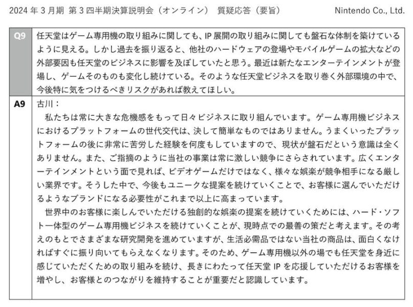 โดยในช่วงถาม-ตอบ มีผู้ถือหุ้นคนหนึ่งเห็นว่า Nintendo นั้นปัจจุบันมีความมั่นคง "หนักแน่นเหมือนหินผา" (Rock Solid) ทั้งในด้านการพัฒนาเครื่องคอนโซลและ IP เกมต่าง ๆ จึงอยากสอบถามว่าบริษัทนั้นมองว่ามีความเสี่ยงจากปัจจัยภายนอกอะไรบ้าง (เช่น สินค้าจากคู่แข่ง หรือเทรนด์เกมที่เปลี่ยนไป)